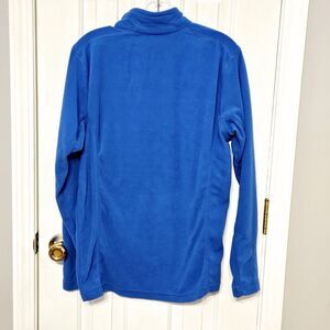 This is a men's Columbia pullover in blue, made of light fleece material. It features a 1/4 zip closure and is a size small. Ideal for winter, this pullover is designed for regular fit and is perfect for outdoor activities or casual wear.
