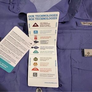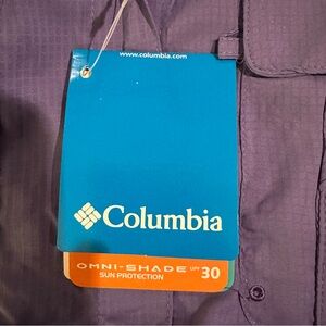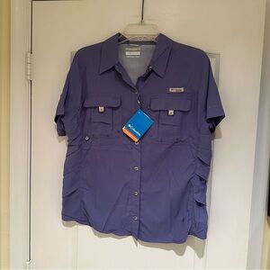 Violet Columbia shirt with short sleeves. Features button-up design and chest pocket.