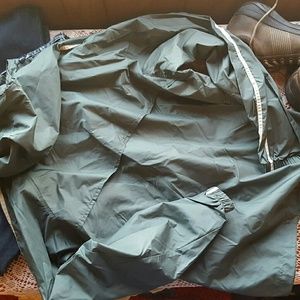 Perfect for those Summer Nights or cooler days. Men's hunter green Columbia packable hooded windbreaker with elastic drawstring bottom. Small hole in one sleeve.