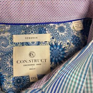 Men’s Construct Plaid Button Up Short Sleeve Shirt Size XXL Stretch blue, green plaid with purple on inside of collar