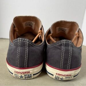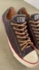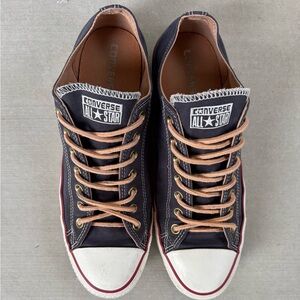 Classic Converse sneakers with navy blue leather canvas. Material is extra soft. Tan- (leather like) laces add a unique look. These shoes are an elavated version of the classic Chucks. Gently worn. Cleaned and ready to ship. Pet free / smoke free home. I have other shoes available in a 10.5. Check out my closet. Happy shopping.