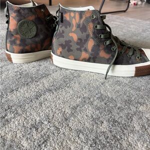 Camouflage pattern with white toe caps. Green laces. Comfortable and stylish.