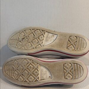 Experience timeless style with these Converse high-top sneakers, featuring a classic white leather upper accented by red & navy detailing. The durable rubber toe cap and traditional lacing system ensure a comfortable fit, making them perfect for everyday wear. Please see all photos.
