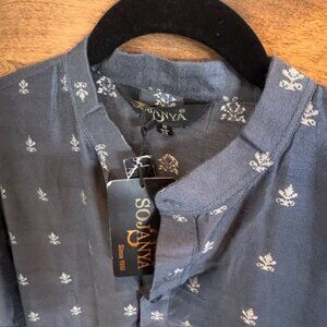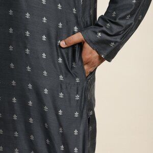 Authentic Sojanya men’s long kurta tunic in charcoal gray with an elegant white floral block print pattern. This traditional Indian kurta is beautifully crafted from a lightweight, breathable fabric — ideal for cultural celebrations, casual wear, or layering for formal occasions.