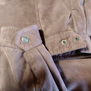 Pre-owned men's Bomber Style jacket. Medium brown with a darker brown collar. The fabric has a sueded finish.