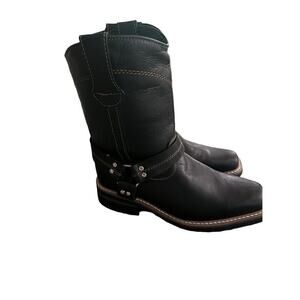 These handmade black leather boots are perfect for any cowboy biker or motorcycle enthusiast. With a stylish harness design, they are both practical and fashionable. The Western style and durable leather construction make them a great addition to any wardrobe.