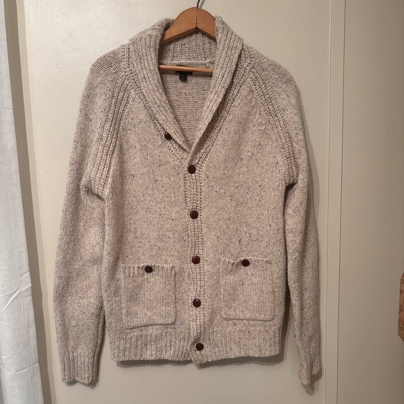 Stay warm and stylish with this cream shawl collar cardigan. Perfect for layering, this sweater offers both comfort and elegance. Very good condition!!