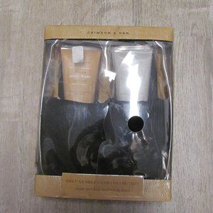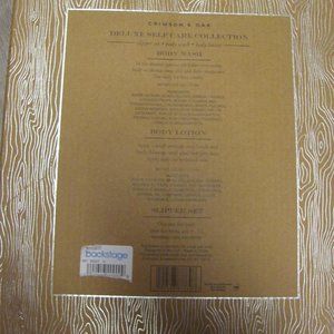This deluxe self care collection for men by Crimson and Oak is brand new. The plastic on the front is ripped, but the contents are in perfect condition. Black fuzzy slippers with a closed toe and open heel fits most men Size 9-11. 6 oz Sandalwood Body Wash, and 6 oz Sandalwood body lotion. I am happy to answer any questions.