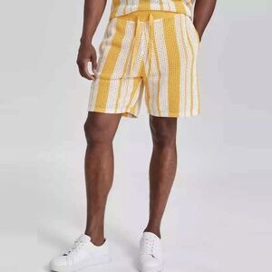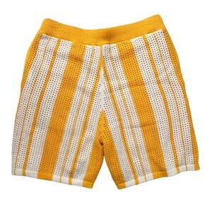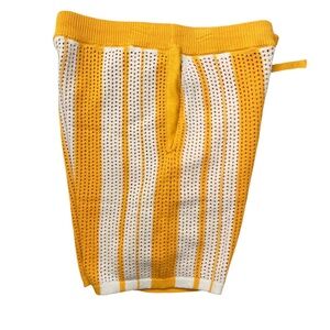 INC International Concepts Men’s Regular Fit Crocheted Stripe Drawstring Shorts. Semi-sheer crocheted sweater shorts with a yellow knit inner short for lining. Hand pockets. No rear pockets. Pull-on styling. Ribbed knit waistband with external drawstring. No fly. Shell: 100% cotton. Lining: 100% polyester.
