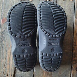 Size 11. Some signs of wear. Small chunk missing from bottom of shoe.