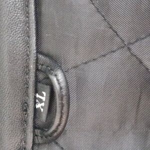 No brand or care information. Quilted black liner. Very nice jacket. Soft yet sturdy leather. (Everyone who sees it wants to try it on.)