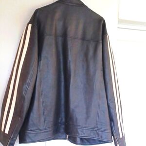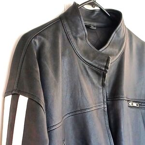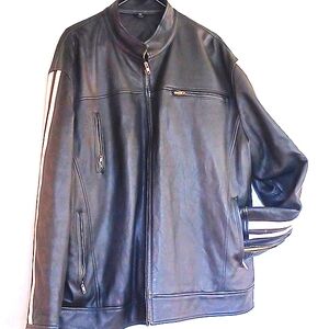 Mens leather motorcycle jacket XL. Black w/ double cream white stripes on the sleeves.