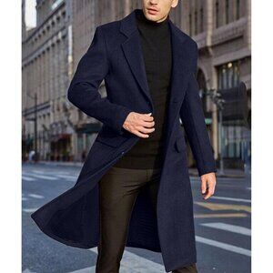 Men's Dark Blue Slim Fit Notched Collar Long Casual Trench Coat with Pocket