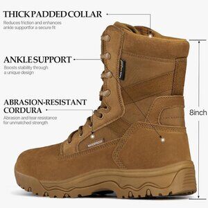WATERPROOF & WARM The waterproof membrane inside the boots for men seals out water and allows moisture to escape, providing a static waterproof capability for up to 4 hours. These tactical boots ensure your feet stay dry in light rain or damp environments. With gusseted tongues that shield against wind and snow, and thick insulated high-tops that lock in warmth ,these mens work boots suitable for all seasons