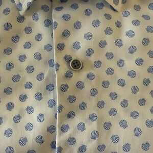 Really soft cotton blend with small sea shell pattern. David Donahue shirts are so well made and comfortable to wear, I have many of them. The fabric is light weight with cool two-tone buttons. Worn a few times, excellent pre-owned condition.