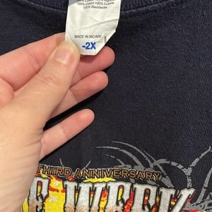 Men’s commemorative 73rd anniversary Daytona Beach, Florida bike week featuring motorcycle with flames canvas design on the back bike with logo on the front featuring skulls flames and scroll in detail 100% cotton pre-shrunk. No stains measurements pit 25.5 inches length 28 inches shoulder seam 23 inches