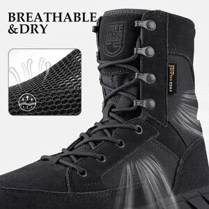 WATERPROOF & WARM The waterproof membrane inside the boots for men seals out water and allows moisture to escape, providing a static waterproof capability for up to 4 hours. These tactical boots ensure your feet stay dry in light rain or damp environments. With gusseted tongues that shield against wind and snow, and thick insulated high-tops that lock in warmth ,these mens work boots suitable for all seasons