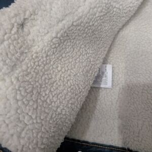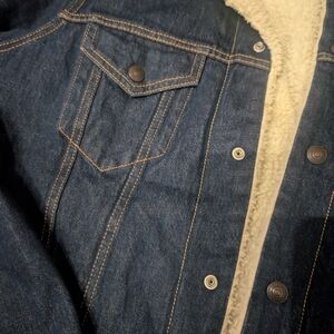 Stay warm and stylish with this classic denim sherpa jacket. Featuring a cozy cream lining, it's perfect for chilly days.