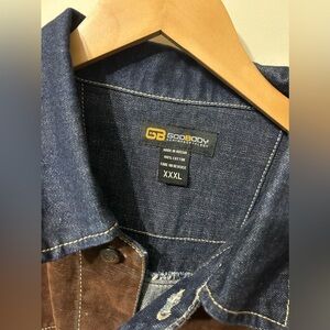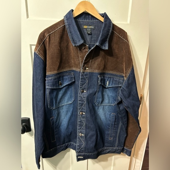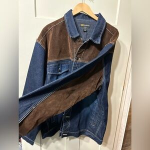 Stylish men's jacket featuring a denim and brown color combination. Perfect for casual outings.
