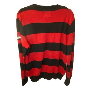 Red and black striped thick cotton sweater. Men's Size Medium. Deus Ex Machina. Label detail on sleeve. Excellent condition.