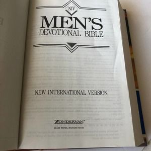 About 9"x 6" pictoral hardcover. Blank presentation page. A Bible for, by and about today's Christian Man. A full year of weekday and weekend devotions located near the designated Scripture provides Spiritual growth and inspiration.