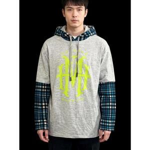 Men's grey Disney hoodie featuring a unique design with plaid patterned sleeves and hood.