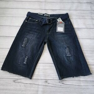 These Men's Distressed Dark Blue Wash Denim Shorts in a skinny fit are perfect for a casual occasion. Made from a cotton and cotton blend denim fabric, these shorts feature a solid dark blue color, zip closure, and a 5-pocket design. The Bermuda style shorts have a flat front and mid-rise fit, making them a stylish and comfortable choice for the summer, fall, or spring season. The distressed detailing adds a trendy touch to the classic denim shorts, while the machine washable material ensures easy care and maintenance.
