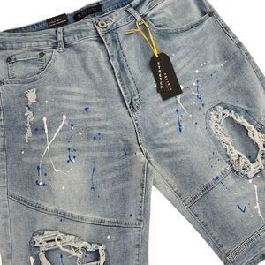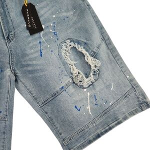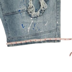 Men’s Distressed Paint Splatter Light Blue Wash Denim Shorts Size 40
