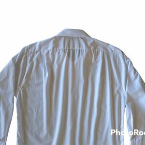 Men's Dockers White Striped Button Down Dress Shirt. Size Large, 16-16.5, 32-33. White in color with lightly textured vertical white stripes. Iron free, fitted. Small white buttons down the front with two extra buttons sewn on the inside bottom. Two button cuff, two on the cuff for tightening and one on the wrist. Small pleats on the top back. Excellent condition, no flaws or wear.