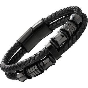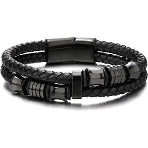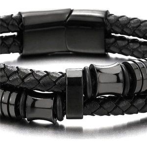🧿Mens Double-Row Black Braided Leather Bracelet Bangle Wristband with Black Stainless Steel Ornaments