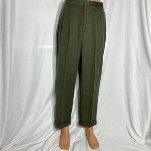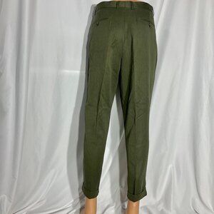 These feel really nice and drape nicely too. They have a pleated front, cuffed hem, and two buttoned back pockets. They are a really pretty dark moss green and they are pretty good about not wrinkling too badly. These are pre-owned and in great condition, not sure they were worn much.