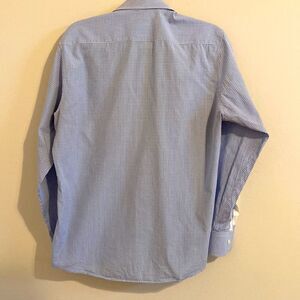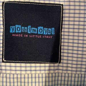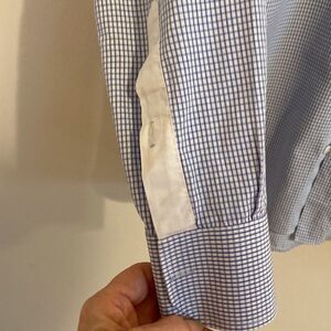 Yossal Moyal custom made shirt, cotton, blue and white check with white tabs on sleeves with button closure. Neck15.5