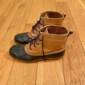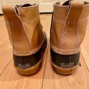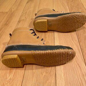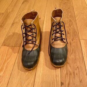 Men's Duck Boots, size 10, unsure of brand. Rarely worn in good condition. Leather uppers and rubber bottoms. Rubber bottoms have some light fading on the black parts. Lace up, laces in good condition.