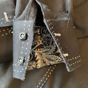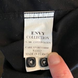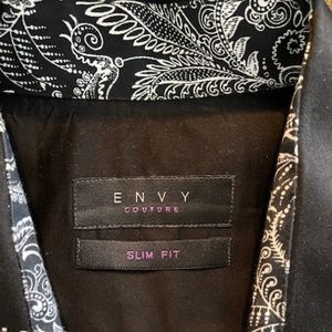 Like NEW worn once MINT condition. This is a Black Saten ENVY dress shirt with white stitching and paisley design on inner cuffs and neck. Very Sharp Very Attractive shirt. Can be worn tucked in, But Its also that perfect length to wear out