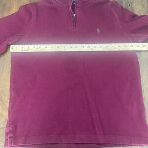 Men’s EUC Polo Ralph Lauren Quarter Zip Pullover. Burgundy. Estate Rib, Medium. Cotton, machine wash. Contrasting green pony on front left chest. Straight, vented hem. See pictures for approximate measurements. Smoke free home. Retail $125