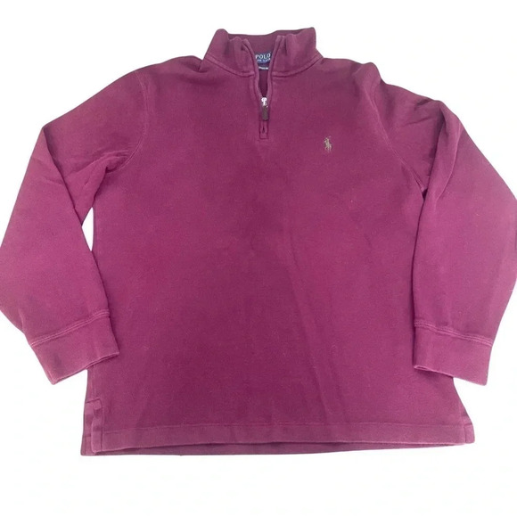 Men’s EUC Polo Ralph Lauren Quarter Zip Pullover. Burgundy. Estate Rib, Medium. Cotton, machine wash. Contrasting green pony on front left chest. Straight, vented hem. See pictures for approximate measurements. Smoke free home. Retail $125