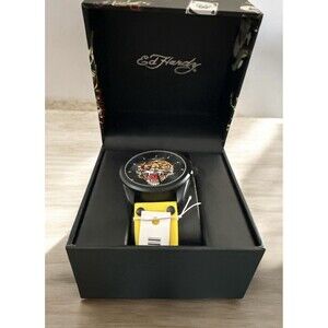 The Mens Ed Hardy Matte Yellow Silicone Strap Watch 46mm with a Tiger design in black is a stylish and modern wristwatch suitable for men. Featuring a quartz movement and water-resistant capabilities, this fashion watch comes in its original packaging with a retail price of $95.00. The yellow silicone strap and case, along with the black dial, create a bold and eye-catching look that is perfect for those who appreciate unique and trendy accessories. F