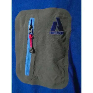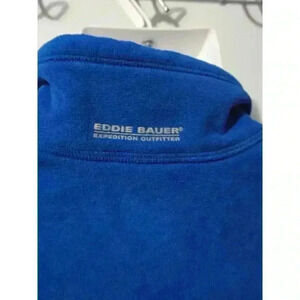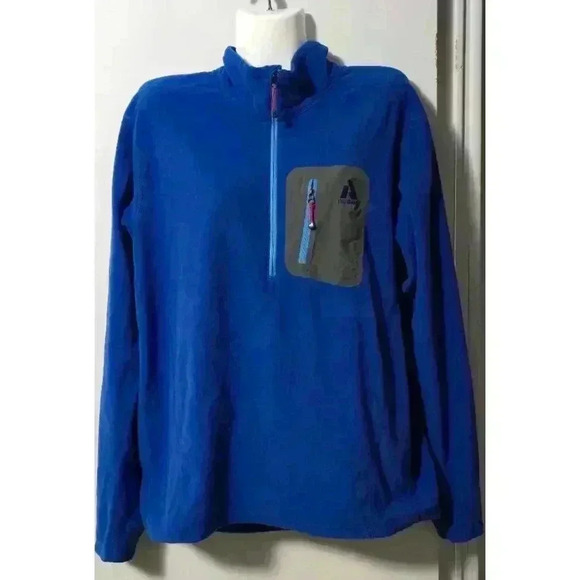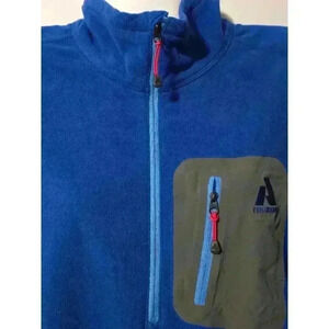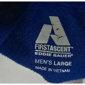 This is a pre-owned Eddie Bauer First Ascent men's fleece pullover in size large. It is blue with a gray and blue zippered pocket on the left chest. The fleece is soft and comfortable. The zipper has a red pull tab. The pullover has a stand-up collar and long sleeves. The fabric is 100% polyester. The pullover is in good condition with no visible tears or holes. There is some minor fading on the logo. The pullover is made in Vietnam.