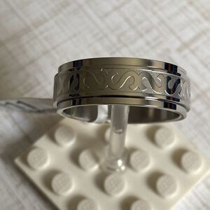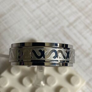 Details: Men’s polished stainless steel ring with interesting details embossed. Good quality piece.