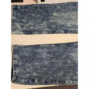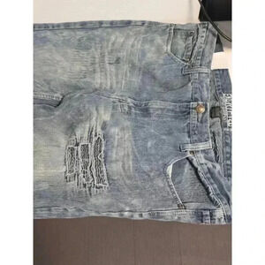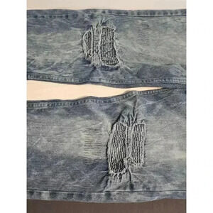 Pre-owned Encrypted Supply Company jeans, size 42. The light blue denim features a distressed, acid-wash finish with pre-made knee holes and visible stitching. The jeans are made of 98% cotton and 2% polyester. They exhibit signs of wear consistent with previous use, including fading and minor discoloration. No other significant imperfections are noted.