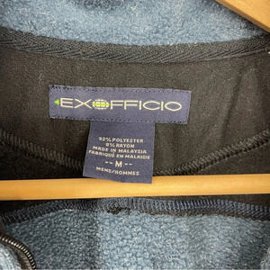 Mens medium ExOfficio blue and black fleece with 1/4 zip and mock neck. Small hidden pocket on the chest. In great condition