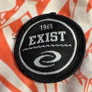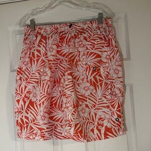 Men’s Exist swim trunks. These trunks have numerous pockets. They are an orange and white color. Size large. Waist measures 15” - 20” with stretch and an inseam of around 8”. Used in good condition.