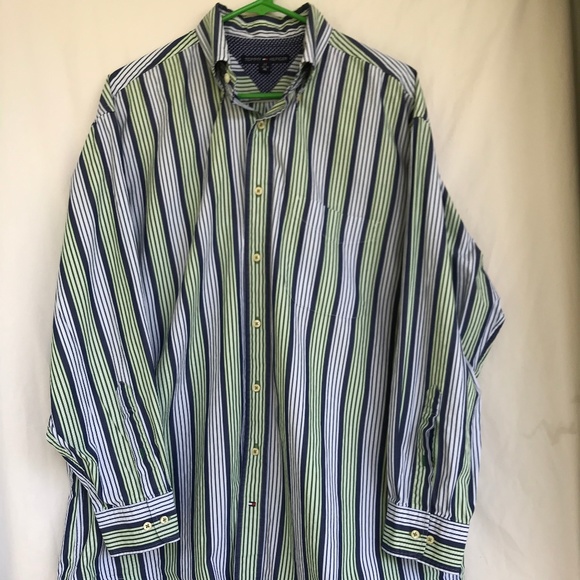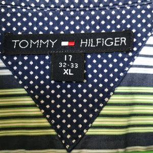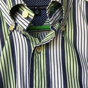 Mens Extra Large Tommy Hilfiger green, blue, white Button down with all buttons and a front pocket.