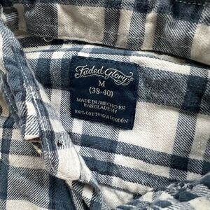 Mens white and blue casual plaid button down shirt from Faded Glory. 2 functional breast pockets, extra buttons sewn into interior side of placket.