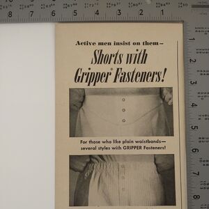 WORDING: Active men insist on them - shorts with Gripper Fasteners - A product of Scovill
