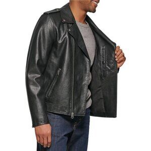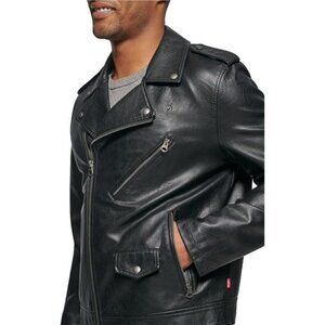 Classic faux leather motorcycle jacket with buffalo plaid lining, zipper front closure, epaulettes on shoulders, zipper detailed cuffs, Levi's red tab on left chest pocket. One chest welt zipper pocket, two lower welt zipper pockets, and one small coin pocket with snap. closure and one interior welt pocket with snap closure. *FUNCTIONALITY: Welt chest zipper pocket and two lower zipper pockets at waist; Welt flap pocket with snap for viable storage and safe keeping