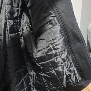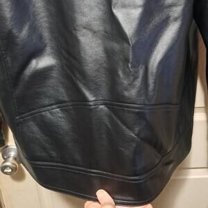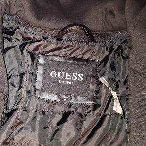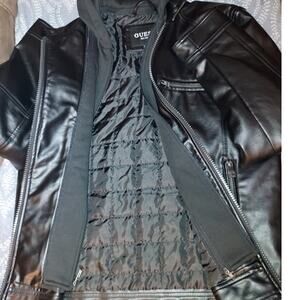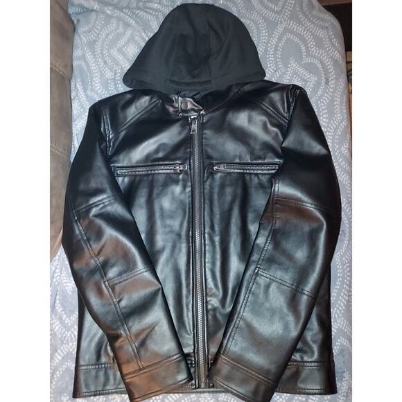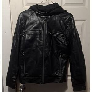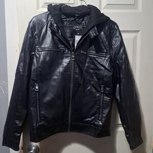 Men's GUESS Faux Leather Detachable Hood Motorcycle Jacket Black Size Large. Offering the warmth and comfort of a pullover with the style and design of a classic motorcycle jacket, this coat features lightweight, faux-leather fabric, a detachable hood and bib and dual zipper pockets at the chest. New. *Original Tag Had Apparently Came Off In Store And Was Replaced With A Store Tag By The Store. Will ship fast and with care!