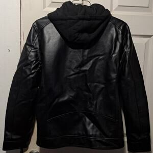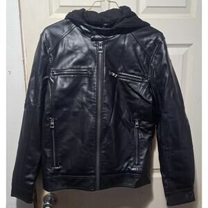 Men's Faux Leather Motorcycle Jacket With Detachable Hood Black Size Large