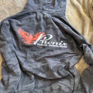 Mens dark grey came Fisherman's Warehouse/Phenix Rods Hoodie, Size Large