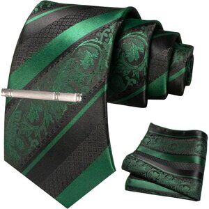 Men's Floral Necktie and Pocket Square Tie Clip Sets for Men Dark Green